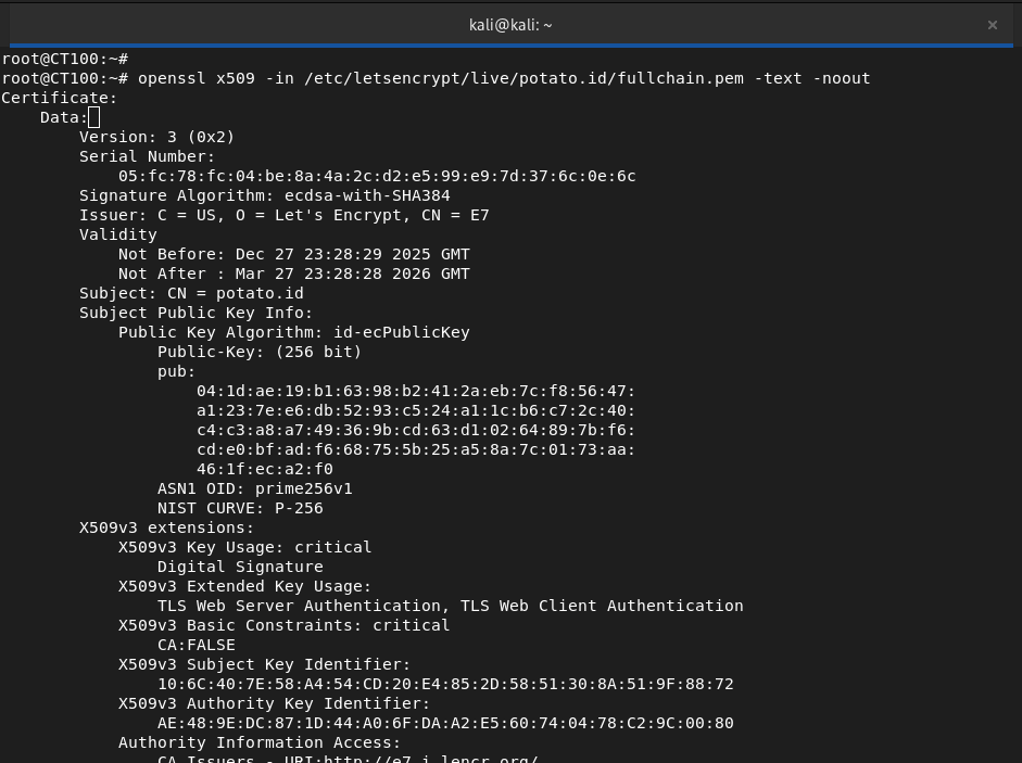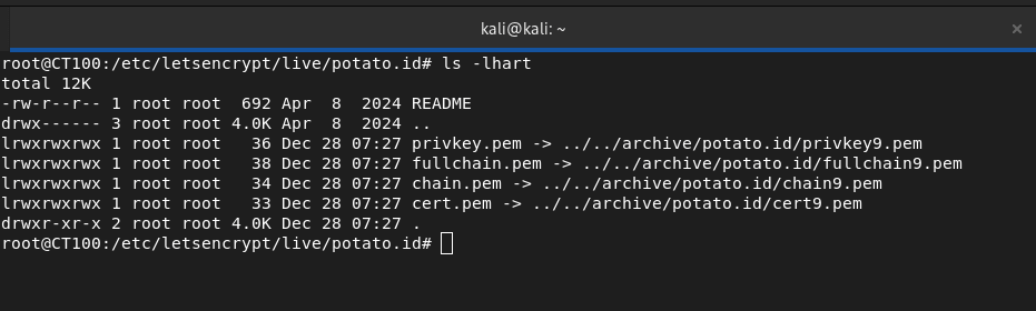 - fullchain.pem : Berisi gabungan sertifikat domain (cert.pem) dan sertifikat intermediate (chain.pem) dalam satu file. Ini adalah file yang paling sering digunakan untuk konfigurasi server (seperti Nginx atau Apache) karena sudah mencakup seluruh rantai sertifikat yang dibutuhkan agar browser bisa memverifikasi koneksi dengan benar.